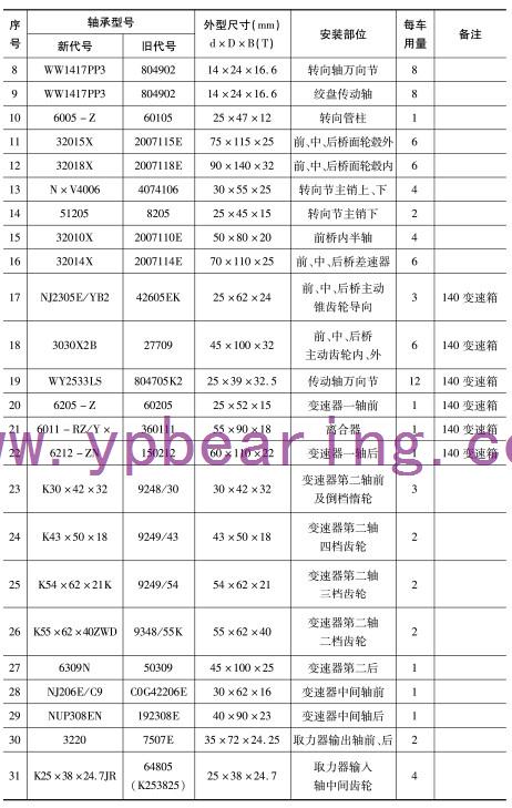 | 序号 | 軸承型号 | 外形尺寸(mm) | 安裝部位 | 每車用量 | 備注 | |